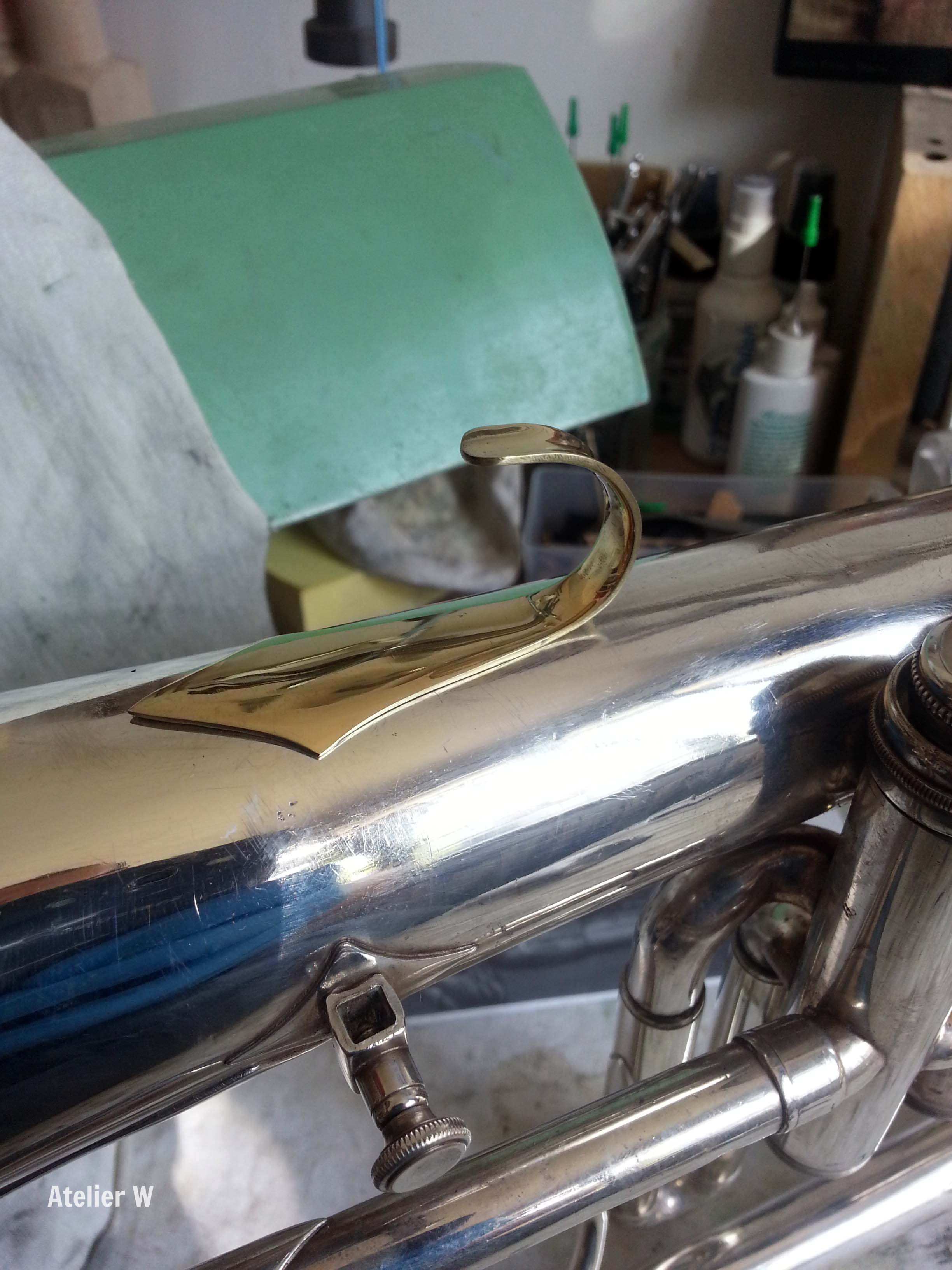 Un très beau bugle argenté Couesnon Monopole de passage à l’Atelier W. Au programme: remise à l’angle de l’entre-deux, fabrication d’un anneau main droite sur-mesure, débosselage et révision complète…