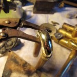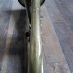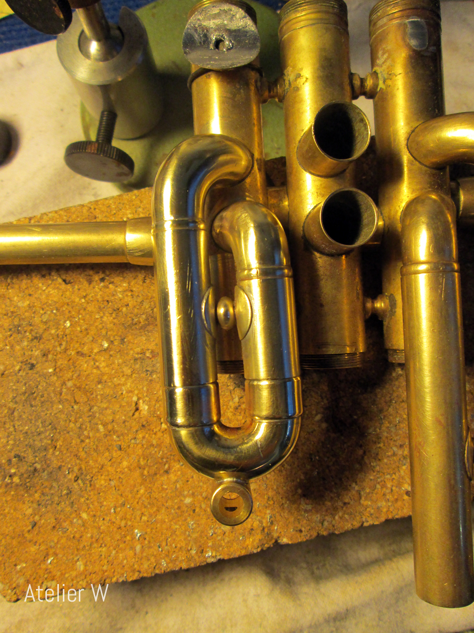 Customisation “lourde” pour la vedette de la maison Couesnon: le bugle Monopole. Au programme: débosselage, géométrie complète de l’instrument (dont celle de la 3e coulisse pour optimiser le fonctionnement du trigger), modification de l’emplacement de l’entre-deux principal, suppression de l’entre-deux pavillon/première suite, pose de clés d’eau Amado (dont une sur la 3e, non présente à l’origine), pose d’un trigger modifié (sortie de coulisse réglable et palette sur-mesure), argenture des coulisses, brossage…pour terminer, fabrication de dessous de pistons lourds, modification des chapeaux d’origine et fabrication de boutons sur-mesure à nacres en ébonite marbrée. Champagne! (un grand merci à Enrico pour sa confiance et pour la bouteille)