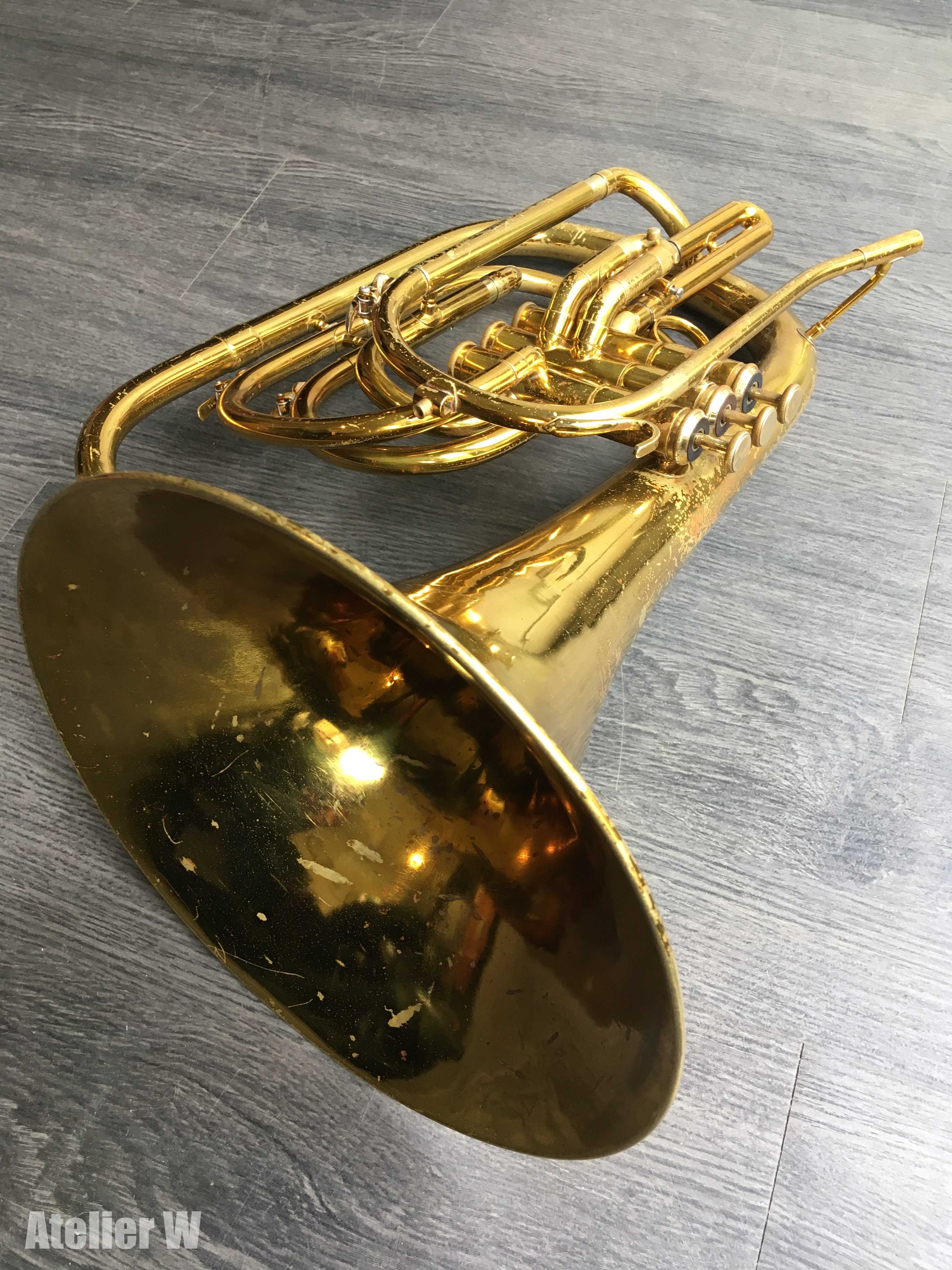 Rare marching french horn ou mellophone en Bb Kanstul USA modèle 285 avec anneau de première coulisse. La compression est bonne, l’instrument est livré avec une embouchure Denis Wick n°7 et sa boîte d’origine. Entièrement révisé pour la vente, garanti un an pièces & main d’oeuvre.