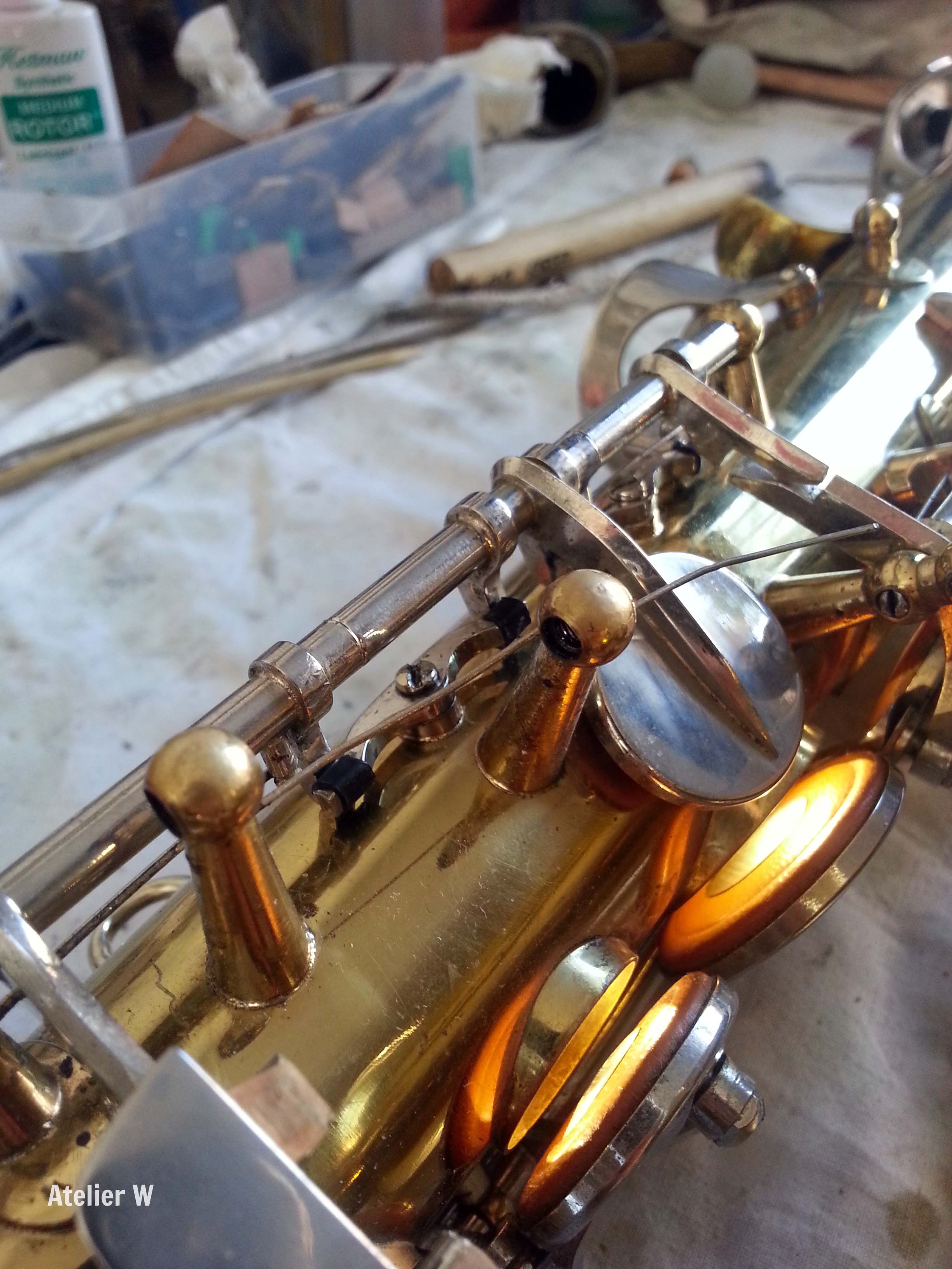 Un oiseau rare de passage à l’Atelier W pour une révision, pour mon plus grand plaisir! Cet alto de facture française est exceptionnel à plus d’un titre: correspondances de clés “au-dessus” (c’est à dire sur les cuvettes et non sur les pieds de clés), placement des clés inhabituel (fa# aigu, sol#), possibilité de descendre d’un demi-ton sur les notes jouées main gauche jusqu’au la en actionnant une clé main droite (fa/mi/ré)….et ça sonne méchamment!